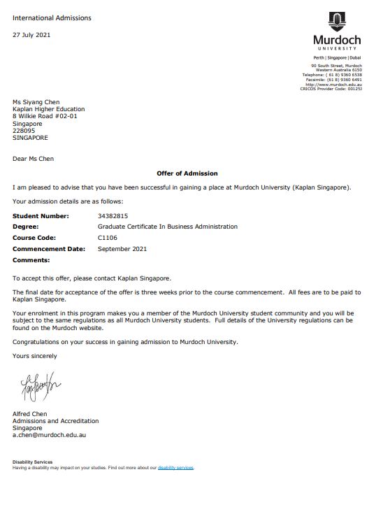 热烈祝贺陈思洋同学获得澳大利亚默多克大学硕士录取通知书